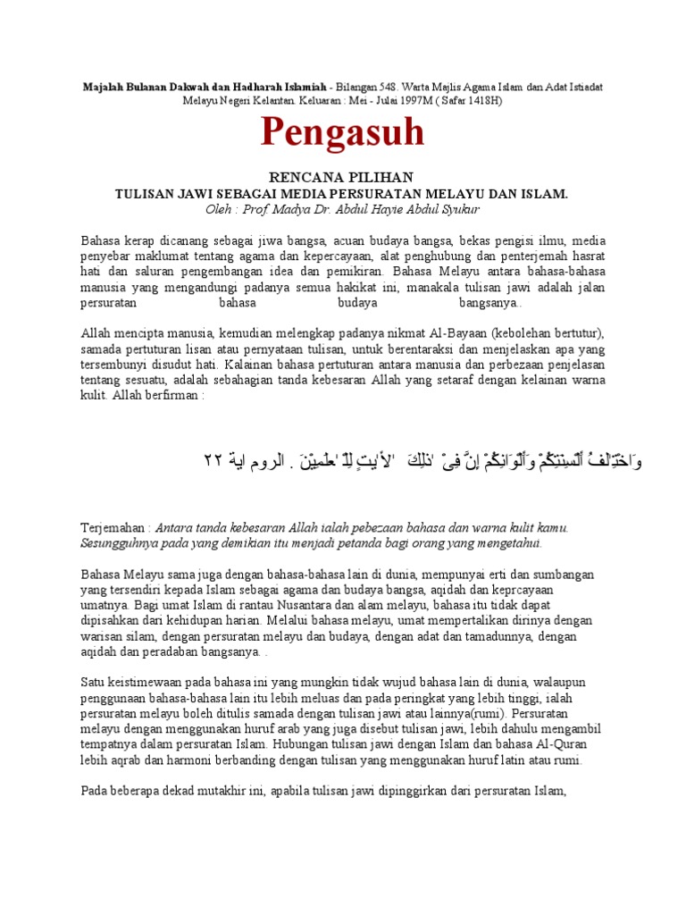 Peranan Tulisan Jawi Peranan utama tulisan jawi adalah dalam menulis kitab- kitab agama karya-karya sastera buku-buku risalah- risalah termasuk juga surat-surat perjanjian dengan negara-negara luar Mohd Alwee Yusof 2005. Walaupun ia tidak terangkum dalam peperiksaan dan hanya dalam lingkungan enam muka surat ternyata cadangan itu mencetuskan wacana hangat dalam. Tulisan Jawi dalam Pelaksanaan Kurikulum Pendidikan Islam Peringkat Sekolah Menengah.